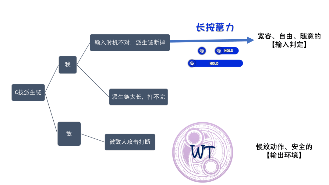 HOLD 机制的引入很好地解决了“手稍微慢一点,整套输入就白费了”的[派生链按不对的问题],派生链也不再要求你一次性把整串指令全敲完(仔细想想这不就是变相 QTE 吗),而是允许你边打边想。