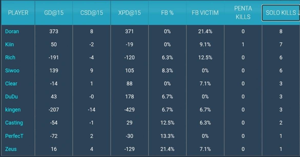 观察数据我们可以发现很多有意思的事情,除了Doran和Zeus的对比之外,其他选手也值得关注,其中曾在LPL赛区效果过的风暴英雄GOAT选手Rich竟然有六次单杀,还能在LCK拥有自己的一席之地,这个含金量还是很高的。