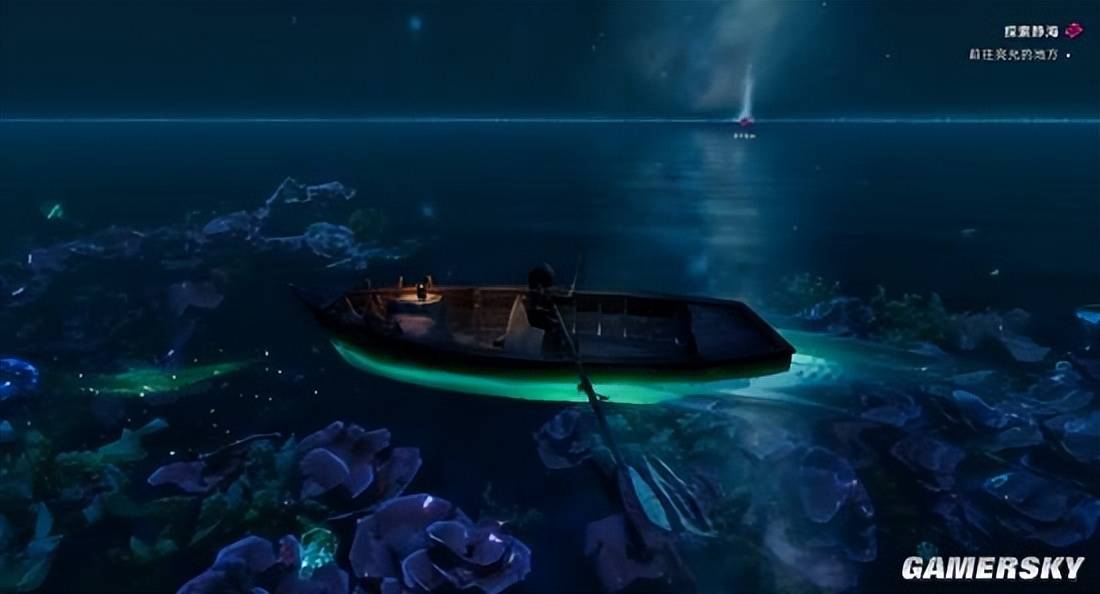 在游戏中,这一抽象概念被制作组以各种形式,更加直观地展示在玩家面前。以序章为例,玩家独自划着一叶小船,伴随着一系列如梦似幻的奇观景象前进:荧光涌动的海底、远处平直展开的海平线,再到最终浮现的巍峨巨船虚影……每一幕都诠释着这个世界的奇异底色,也再次勾勒出游戏独特的美学风格。