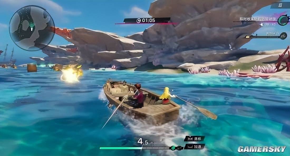 与此同时,“跑船”这一具体的行进过程,实际也再次成为玩家海上开放世界探索的一环。游戏广阔的海域间其实散落着大大小小的各种奇遇事件,玩家可以通过解密、打气球捞沉船、竞速小游戏等一系列方式,来获取buff、改造船只的特定资源,为之后的流程做好准备。