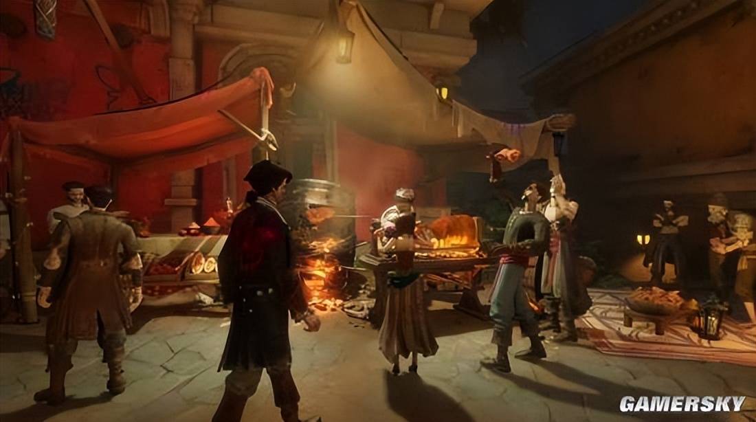 俗话说“奥托皮亚无闲人”,制作团队则同样构建起了一个相当经典且饱满的海盗城市与群像舞台:商业区的水手集市人口密集、烟火气十足,各路商贩吆喝与娱乐活动混杂其间;而下层的船坞码头则是另一番繁忙景象,船老大、工匠乃至黑市奸商各司其职,来来往往......据介绍,游戏中部分NPC其实会有自己的故事和单独行动轨迹。而在实际游玩过程中,你也可以在多处感受到制作组这种有意强调的叙事沉浸感。