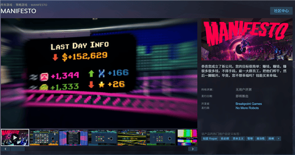快科技2月6日消息,由英国No More Robots发行、Breakpoint Games开发的经营模拟游戏《MANIFESTO》于2月5日在Steam开放免费试玩,预定2026年内发售,以黑色幽默诠释极端讽刺的企业文化。