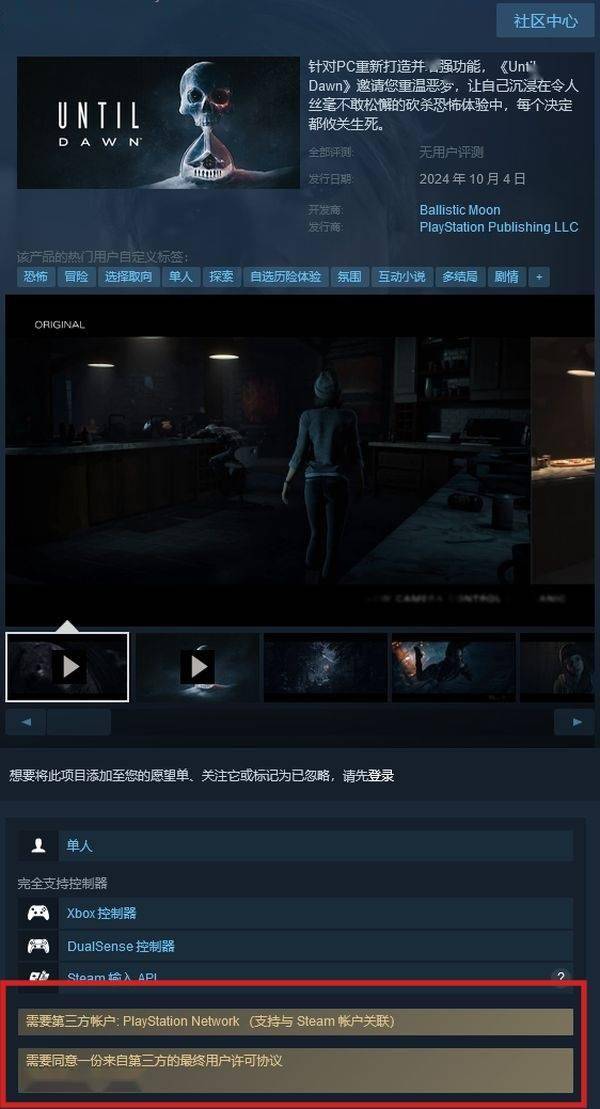 《直到黎明》已在 Steam 平台上线,该作仍需要捆绑 PSN 账户,自带简体中文。