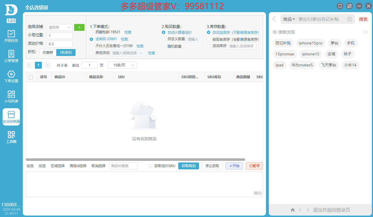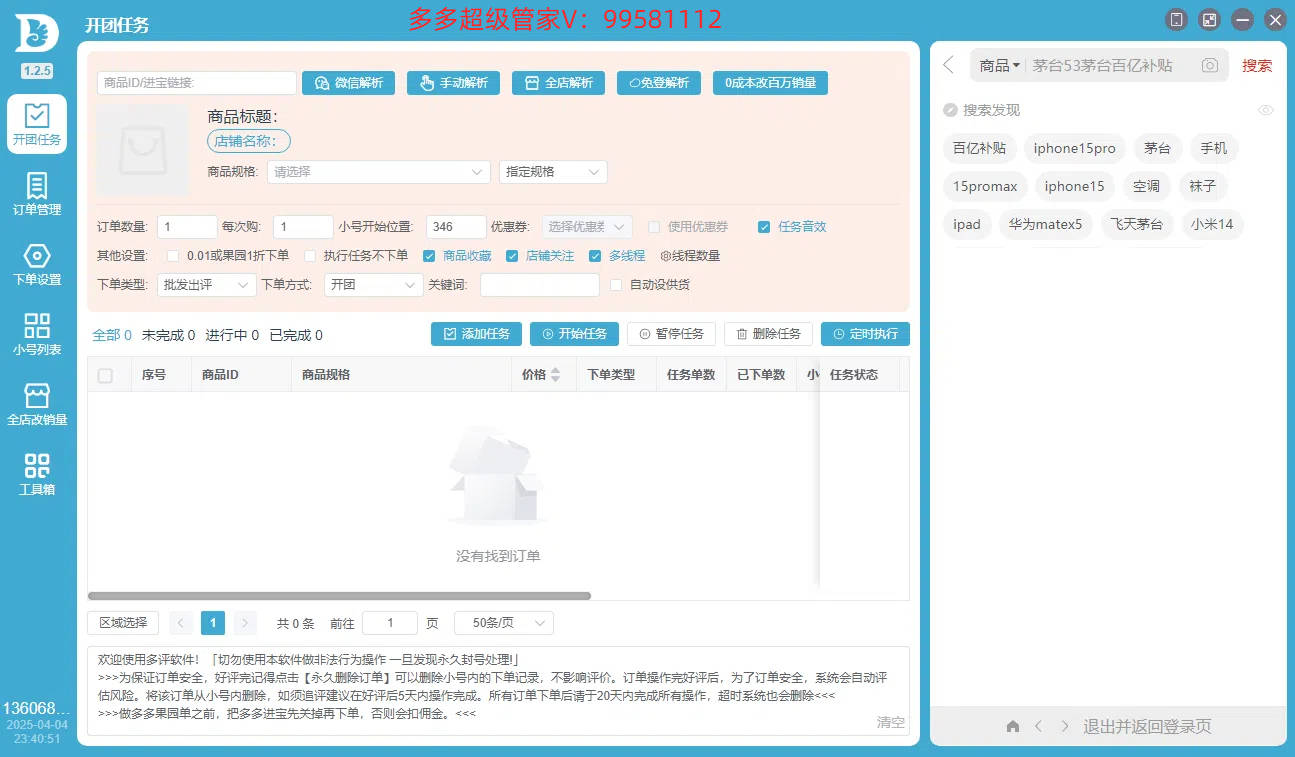多多超级管家支持多多95%上评、多线程下单、云端存储资料、十万地址库、专为拼多多商家打造下面分别介绍。1. 批发下单这个不用过多讲了,出评价用。2. 搜索下单提示链接热度和开团。3. 直接下单直接访问链接下单,开团使用或者虚拟产品出评用。4. 多多进宝从多多进宝入口下单,出评使用。5. 拼内购下单现在不怎么用,此处不表。6. 限时秒杀清除活动库存,经常玩秒杀的都懂。7. 万人团从万人团资源位拍,和秒杀一个性质,清库存。8. 多多果园开团使用.