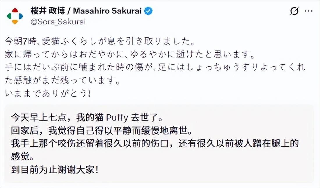 但在2月6号,樱井政博突然发推,表示爱猫已经去了喵星。