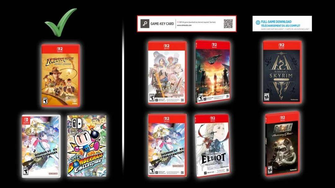 根据厂家公布的信息,更只有《夺宝奇兵:古老之圈》NS2版、《数码宝贝物语:时空异客》NS版及《超级炸弹人合集》NS版三款实体卡带,其他均为钥匙卡或数字下载版。