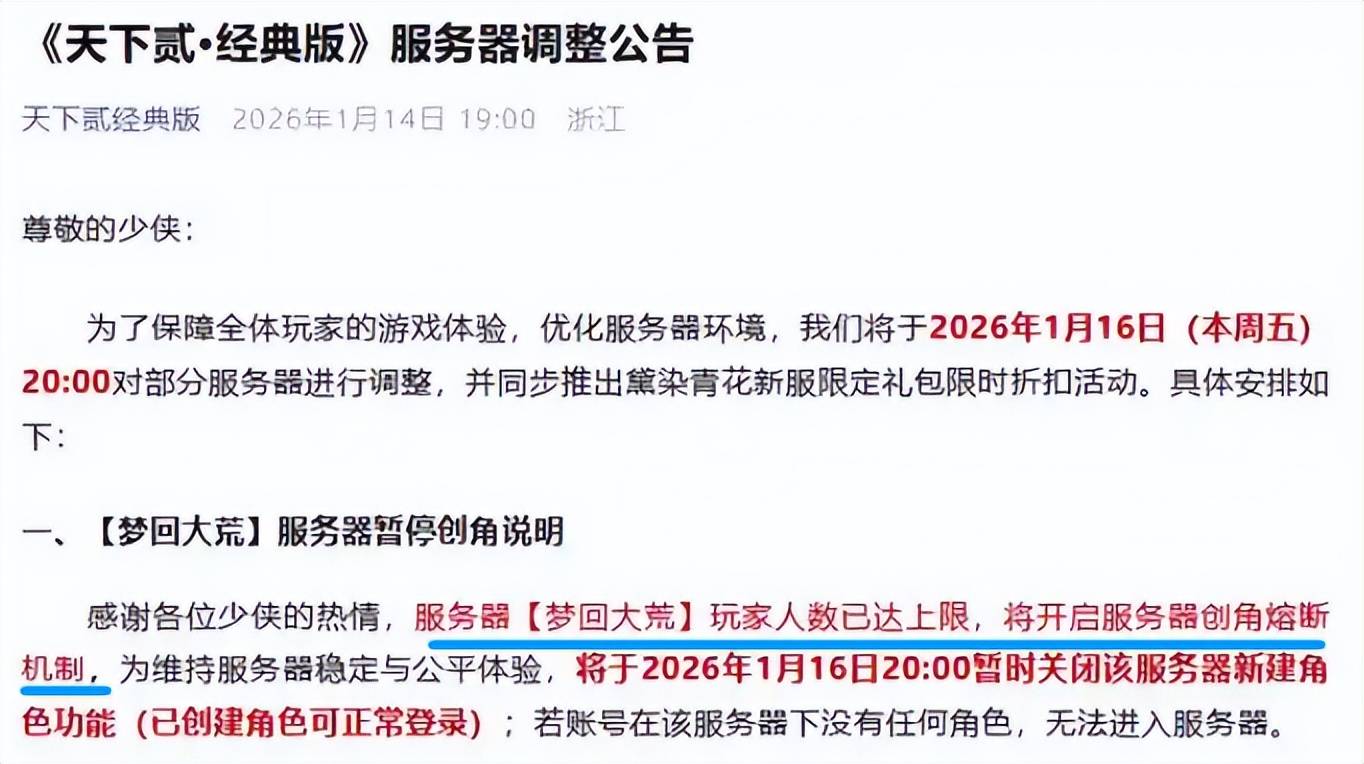 眼看就要陷入瘫痪,官方紧急触发“熔断机制”,暂时关闭该服务器的新角色创建功能,优先保障已入驻玩家的游戏体验。