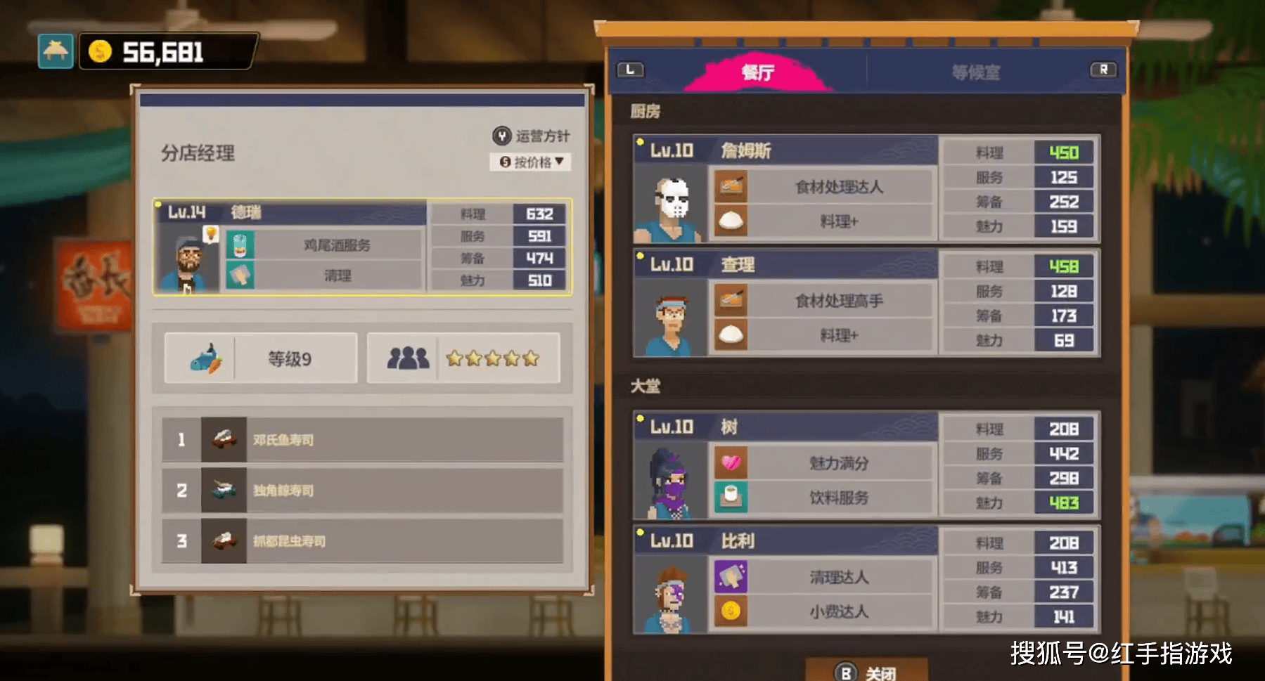 倒茶倒酒时分别计时4秒与控制20%泡沫量,大堂优先雇用猛禽(芥末+调酒)和埃尔尼诺(清洁+饮料),厨房前期用真纪,后期转詹姆斯+米仓组合。