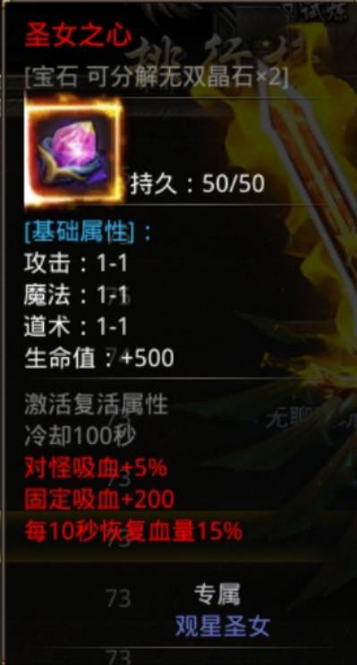 7.圣女之心:这个装备是由白名怪物观星圣女爆出来的极品减伤神器,这个装备不光给玩家加大量的减伤,同时也加对怪嗜血。