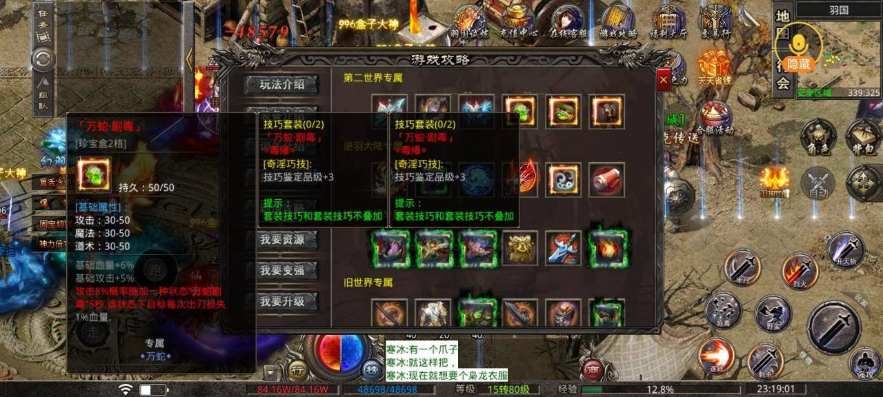 6.万蛇两件套:这个两件套是由盘蛇窟底层召唤万蛇几率爆出,这两件装备搞到手可以增加技巧词条+3,这个可能不太好爆,有条件的玩家可以用点元宝去收购,技巧的效果是可以在打怪的时候触发群毒,这样刷怪效率也会提升一个级别。