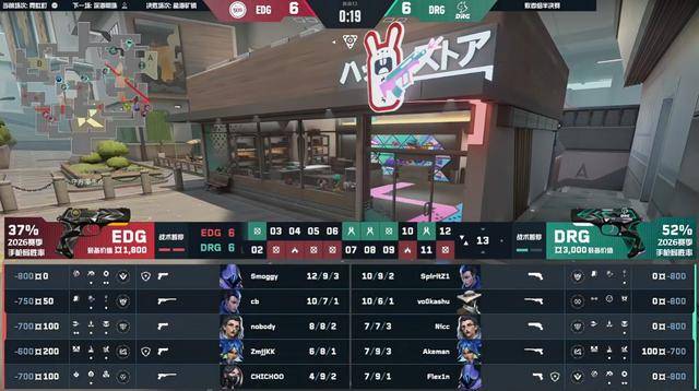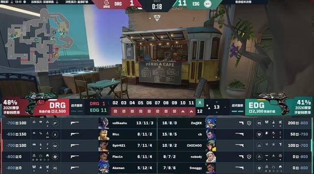 上半场EDG打出六连胜主导比赛,EDG拿到8分。DRG进攻一直处于信息弱势,好在最后几个回合,DRG经过暂停调整拿到4分。