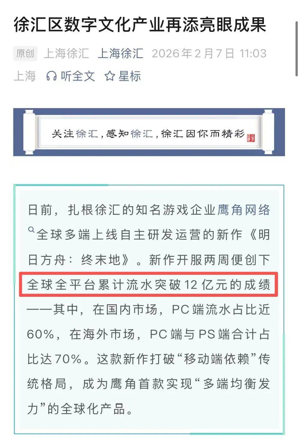 根据上海徐汇官方发布鹰角网络自主研发并运营的新作《明日方舟:终末地》在 线后的短短两周,全球全平台累计流水已经突破了12亿元大关。