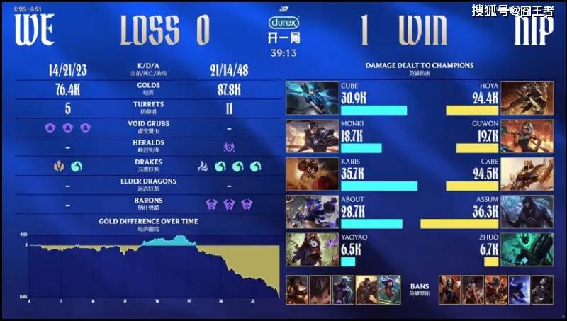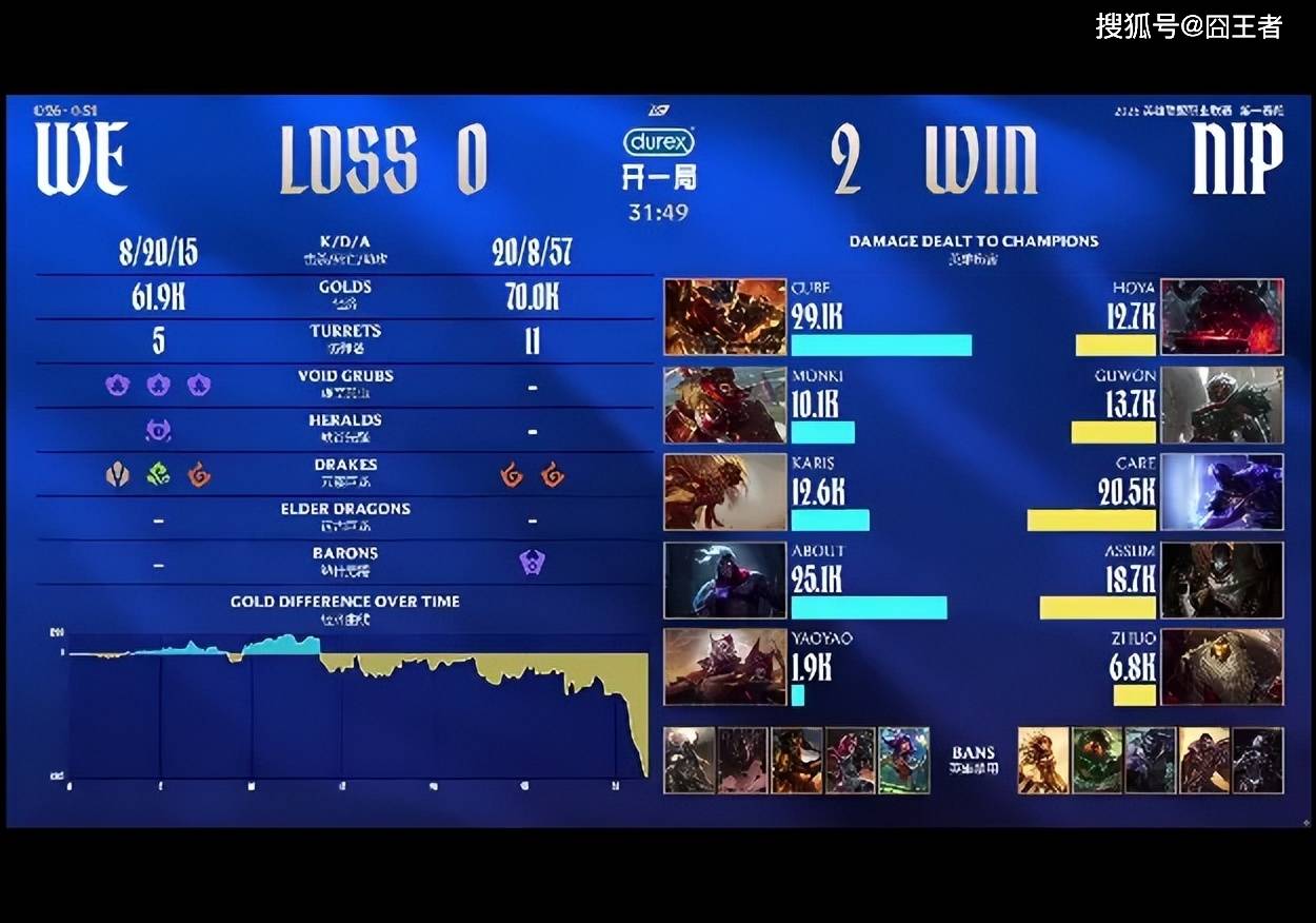 结果第一局比赛,两队拼尽全力,经济几经翻转,NIP笑到了最后。;10分钟,格温上路单杀鳄鱼,但芸阿娜再次阵亡;14分钟,NIP在野区打出1互换3;17分钟,赵信在野区大发神威,WE打出1换2;24分钟,WE开打大龙,但奇亚娜抢下大龙,后续WE打出1换2;27分钟,NIP面对开团打出0换3;30分钟,NIP拿下大龙并击杀赵信;36分钟,赵信之间被秒,NIP拿下大龙和龙魂;最终39分13秒,NIP攻入高地,随后顺利一波