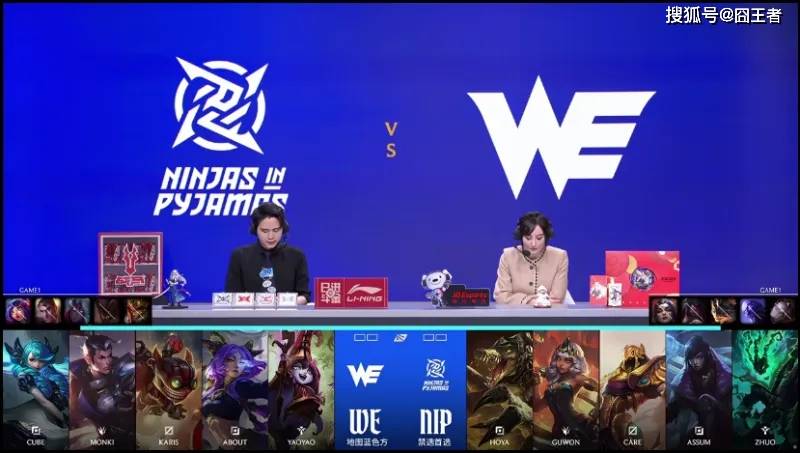 第一局比赛,WE蓝色方,禁用:妮蔻、杰斯、韦鲁斯、石头人、赵信,选用:Cube格温、Monki赵信、Karis炸弹人、About芸阿娜、Yaoyao露露;NIP红色方,禁用:发条、瑞兹、兰博、阿卡丽、妖姬,选用:Hoya鳄鱼、Guwon奇亚娜、Care沙皇、Assum月男、Zhuo锤石