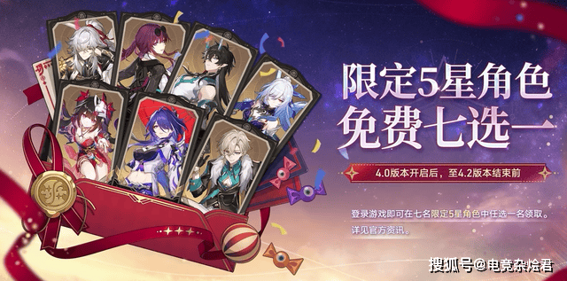 此外,4.0版本登录即可在景元、卡芙卡、饮月、镜流、花火、黄泉、砂金这七位限定五星角色中免费任选其一。