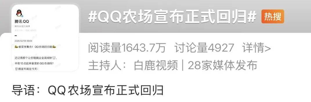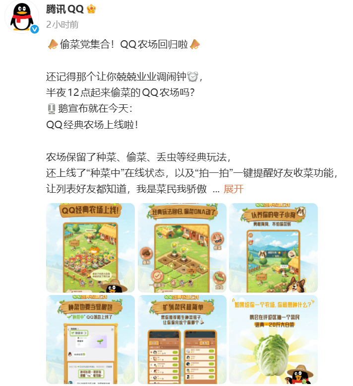 2月6日上线当天,有关《QQ经典农场》的讨论以近乎垂直的态势上扬,微博、小红书等各大社交平台上,关于游戏的词条占领热搜,人人又开始讨论“收菜偷菜”,让人恍惚好像一下穿越回了十几年前的互联网。