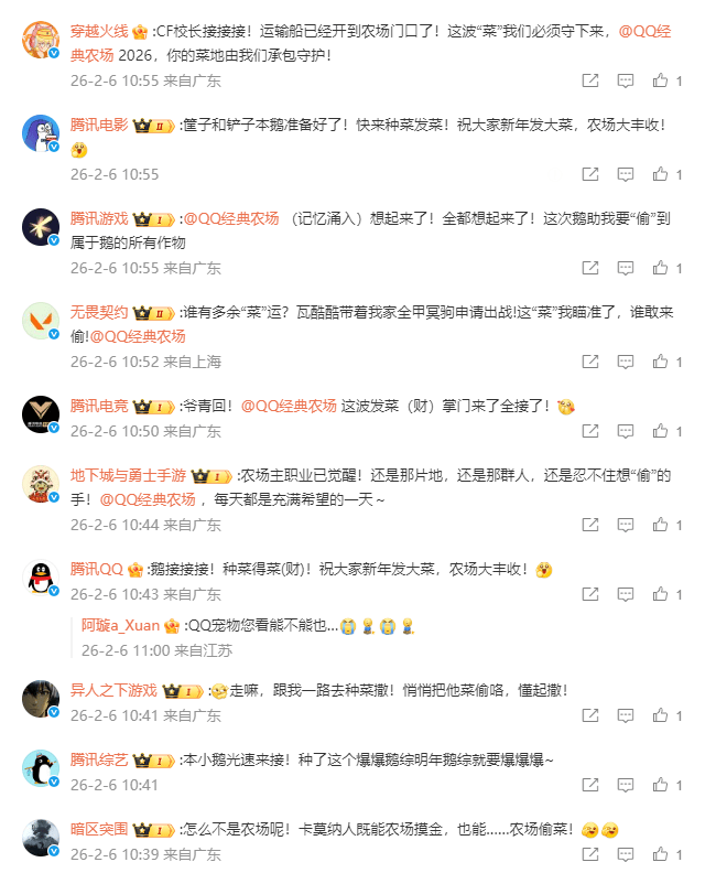 《QQ经典农场》正式上线当天,腾讯旗下各路产品的官号纷纷送上祝福。除了能看到《暗区突围》《异人之下》《无畏契约》《英雄联盟》等等等等耳熟能详的游戏,还有来自“腾讯视频”“腾讯QQ”官号的跨圈层关注,这种“一家亲”上场的阵仗,本身就引发了不少网友围观。