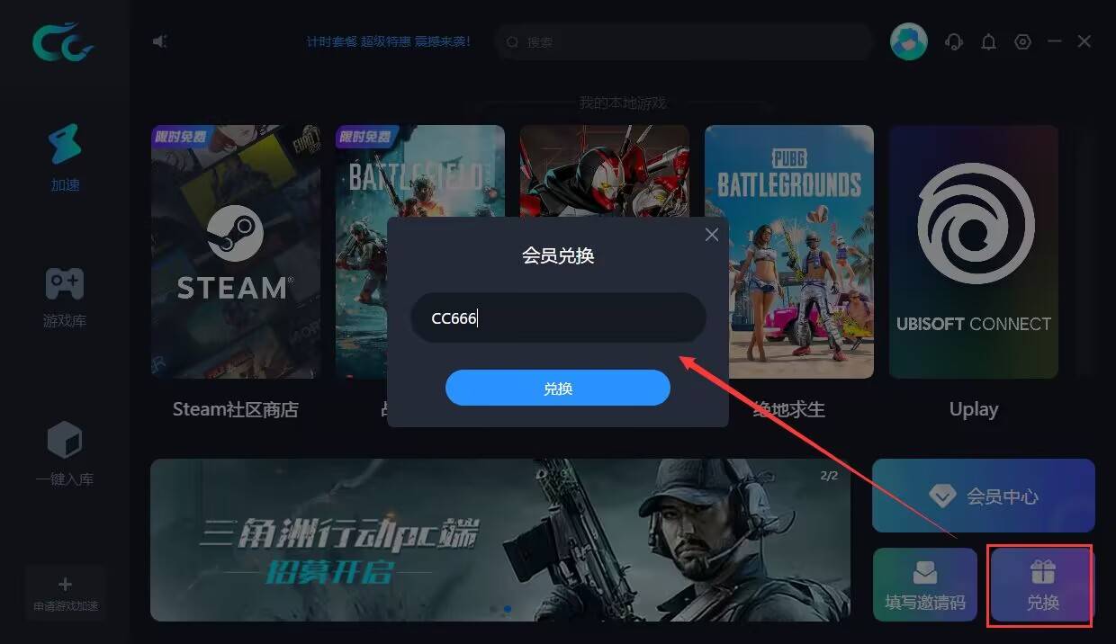 此外,PC用户可以在CC加速器PC版中输入兑换码CC666,即可获得三天的免费加速。