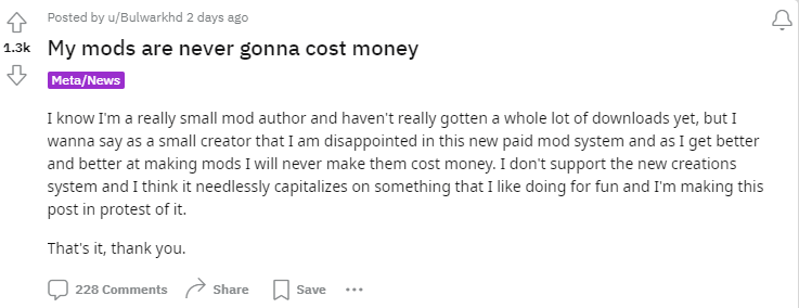 但很多人对这个结果显然是不满意的——B社仍然在加快推进官方MOD平台的发展步伐,意向十分清晰。于是不少开发者表示失望,且宣称自己制作的mod永远不向玩家收费。一些在社区颇有名气的开发者还公开表示,将永远不向官方提交MOD以示抗议。