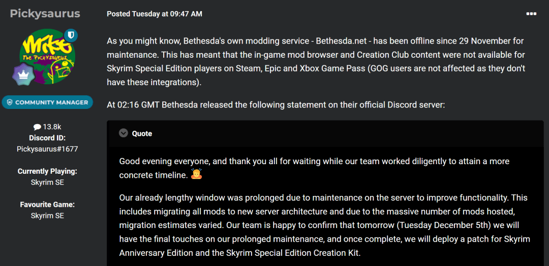 本次更新后,不少玩家反映该工具一度使用受限。好在一切只是虚惊一场,B社的社区经理专门在NexusMods发帖表示,官方正在和SKSE64团队合力修复该MOD。