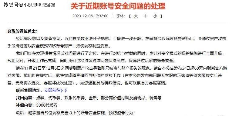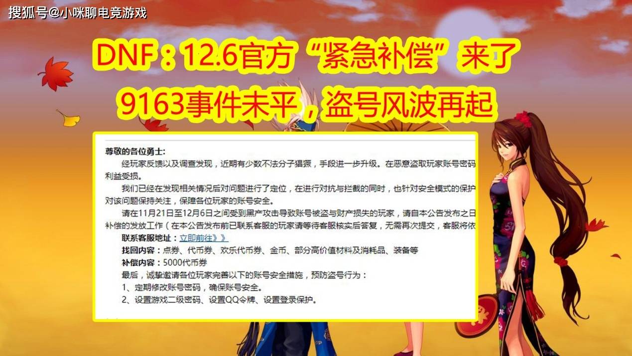 最近DNF官方发布了一则令人担忧的消息:12月6日更新后,出现了盗号事件,导致部分玩家的游戏账号被盗。为了补偿受害玩家,官方决定提供5000代币券的补偿。然而,这个官方紧急补偿引发了争议。