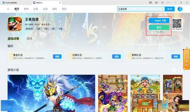 启动已安装的MuMu模拟器,在模拟器内的游戏中心搜索“王者勋章”,点击下载并安装游戏。