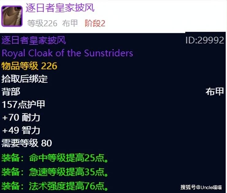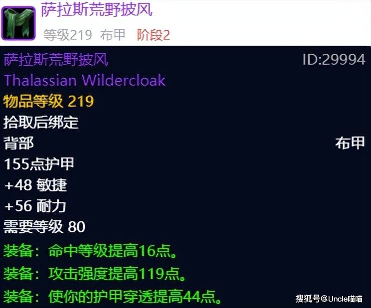 物理系披风虽然说有末日行者的暗铁作战披风在,但是考虑到性价比和命中容错率,喵叔今天还是给凯王子的萨拉斯荒野披风给抬上来了,这东西其他职业暂且不论,猫德和猎人是可作为首选的极品,现在基本上2000金币以内能拿下,也不算贵了,不知道各位猫德和猎人大兄弟是否已经拿下了?