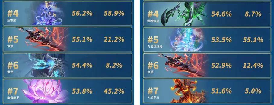 最后在中低段位上,宁荣荣依然是辅助的第一,这也一定程度上体现了高段位和中低段位在辅助上的需求与使用区别,而除了莫长歌、噬魂比比东之外,焱能够在低段位以5%的出场率获得51.6%的胜率,这点也有点出乎维一的预料,第一是这个角色在前阵子刚刚遭过大砍一刀,如果没有那一刀的话,可能焱目前都可以去竞争前3了吧......然后焱也属于一个被动操作+稍微有点拖时间的角色,所以目前部分朋友对于他的看法也是比较两极化的。