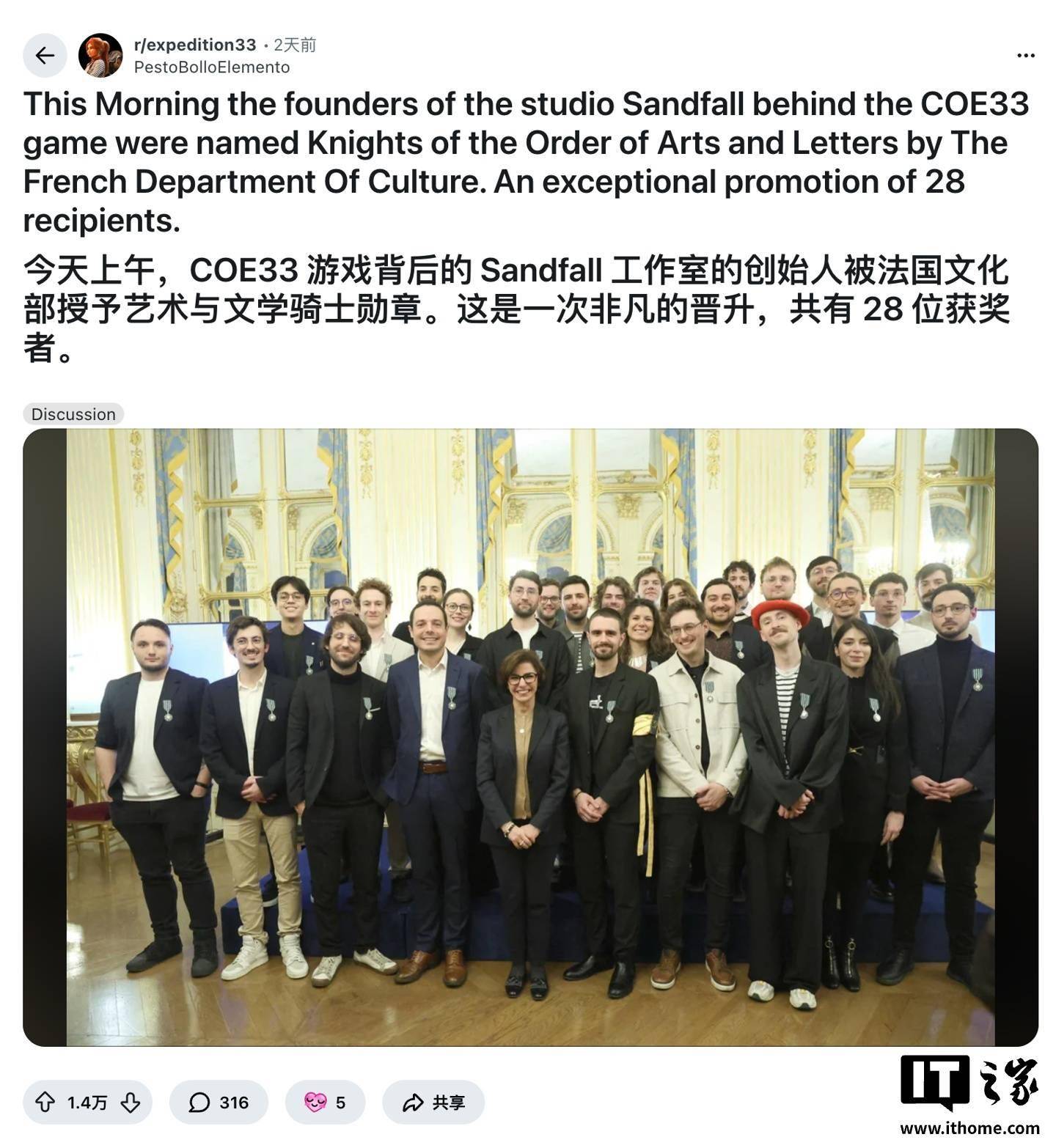 据游戏官方 Reddit 社区,2 月 6 日,Sandfall Interactive 的三位创始人吉约姆 · 布罗什、汤姆 · 吉尔明与弗朗索瓦 · 梅里斯,以及团队中另外 25 位成员被法国文化部授予法兰西艺术与文学骑士勋章称号,这是法国在文化艺术领域的最高荣誉之一。此前获此殊荣的游戏界人物包括马力欧创造者宫本茂和《塞尔达传说》系列制作人青沼英二。