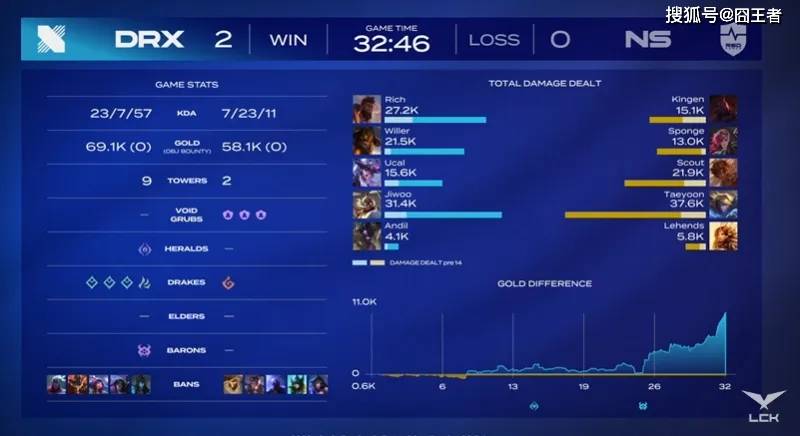 结果第二局比赛,依旧是被DRX打成了碾压局。8分钟:皇子gank下路配合队友击杀对方双人组;11分钟:DRX拿下小龙并击杀抢龙的蔚和曙光;22分钟:Andil牛头灵性传送门绕后闪现击飞Scout岩雀拿下人头;25分钟:Jiwoo飞机团战完美发挥,DRX四打五击溃NS拿下大龙;27分钟:岩雀再次被瞬秒,DRX打出一换三拿到龙魂;最终32分46秒:DRX中路团战零换五团灭对手一波结束比赛