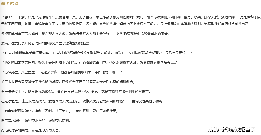 别急,还有反转!你以为卡卡罗大人只强在二创吗?不不不,他在游戏背景中其实是真的强,琳奈剧情里面她作为一个雇佣兵在新联邦活的无比昏暗,偷偷顶替别人出来上学,而卡卡罗,在新联邦混成了跨国独立雇佣兵组织“幽灵猎犬”的团长,还有什么各种逆天传说,说他七天七夜滴水不喝,为了骗取信任雇佣杀手杀自己一类的,但这些在随时随地超频面前都是弟弟,椿在档案里面记载超频一下就要嗝屁了,这货能一直超, 想开就开,想关就关,对身体还没多大副作用,别人身上都是失控,卡卡罗身上叫增幅,堪称索拉里斯耐超王。