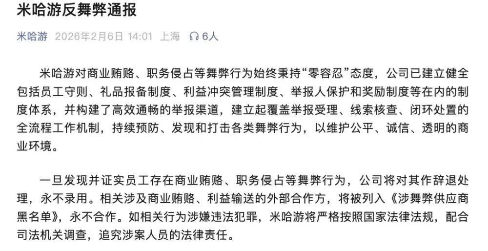 【2】2月6号,。在通报中,米哈游称,对商业贿赂、职务侵占等舞弊行为始终秉持“零容忍”态度。一旦发现并证实员工存在商业贿赂、职务侵占等舞弊行为,公司将对其作辞退处理,永不录用。