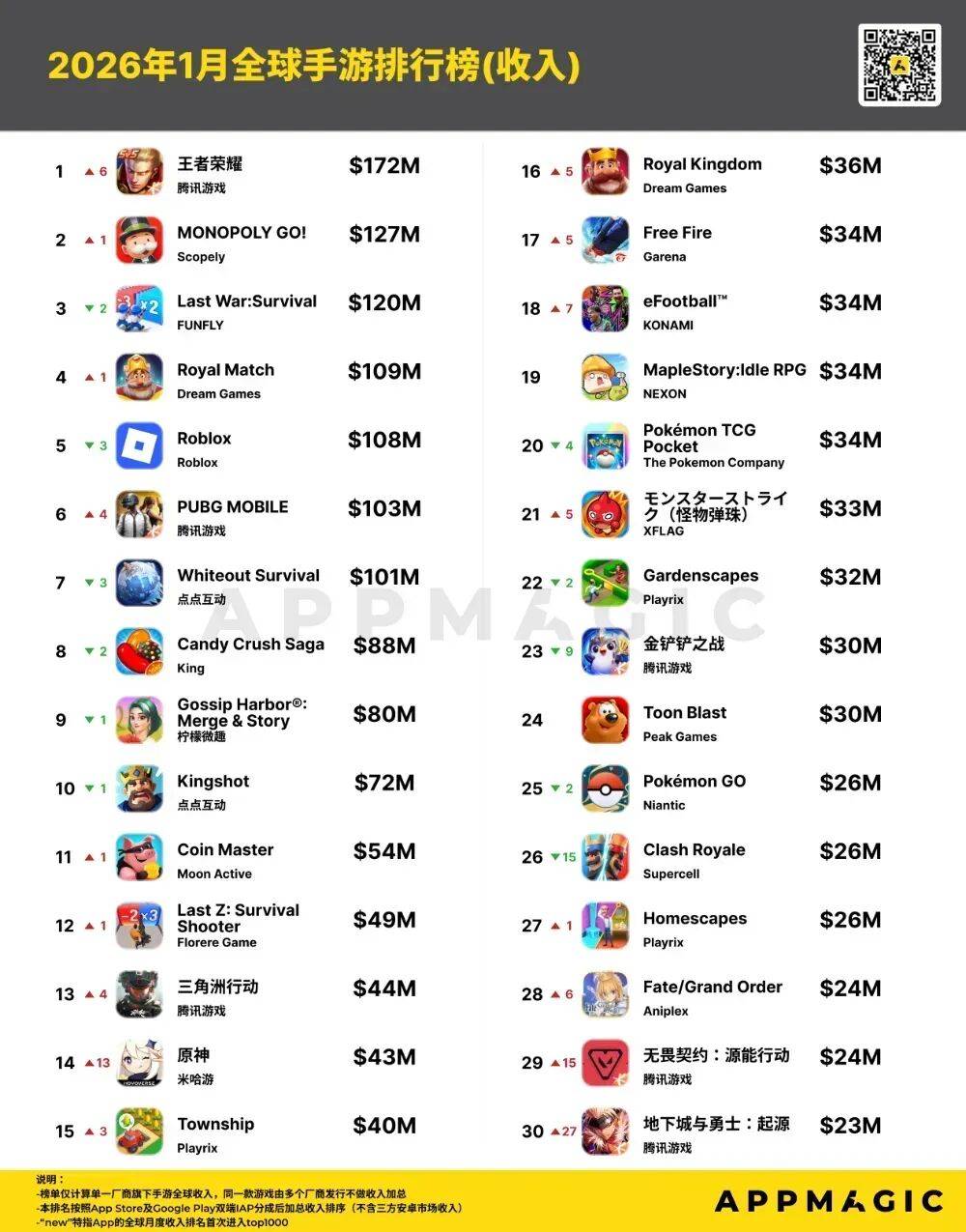 数据显示,2026年1月移动游戏市场全球玩家支出约65.27亿美元,环比增长4.7%,市场整体增速较去年12月有所回升。在收入排名方面,腾讯旗下《王者荣耀》以超过1.72亿美元(约合11.9亿元人民币)的月收入夺得第一,环比实现翻倍增长。该游戏在1月推出S42新赛季、新英雄及多款限定皮肤,有效拉动了玩家付费。