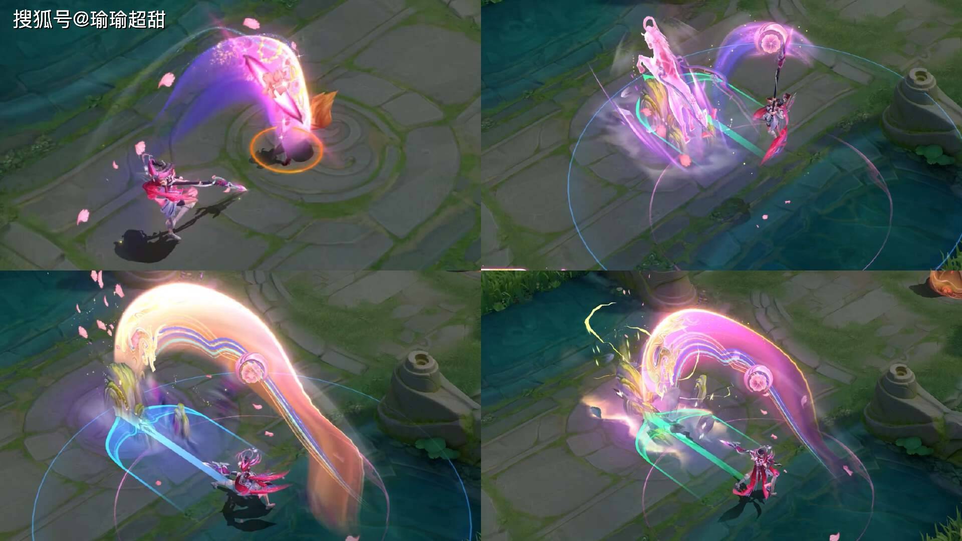 然后我们再来看一下技能特效。技能特效的整体展现虽然是彩色的,但是粉色的主题比较多,每次普通攻击,包括技能施法的时候,都会看到有粉色的花瓣效果,展现出了一种花瓣纷飞的落叶美感。