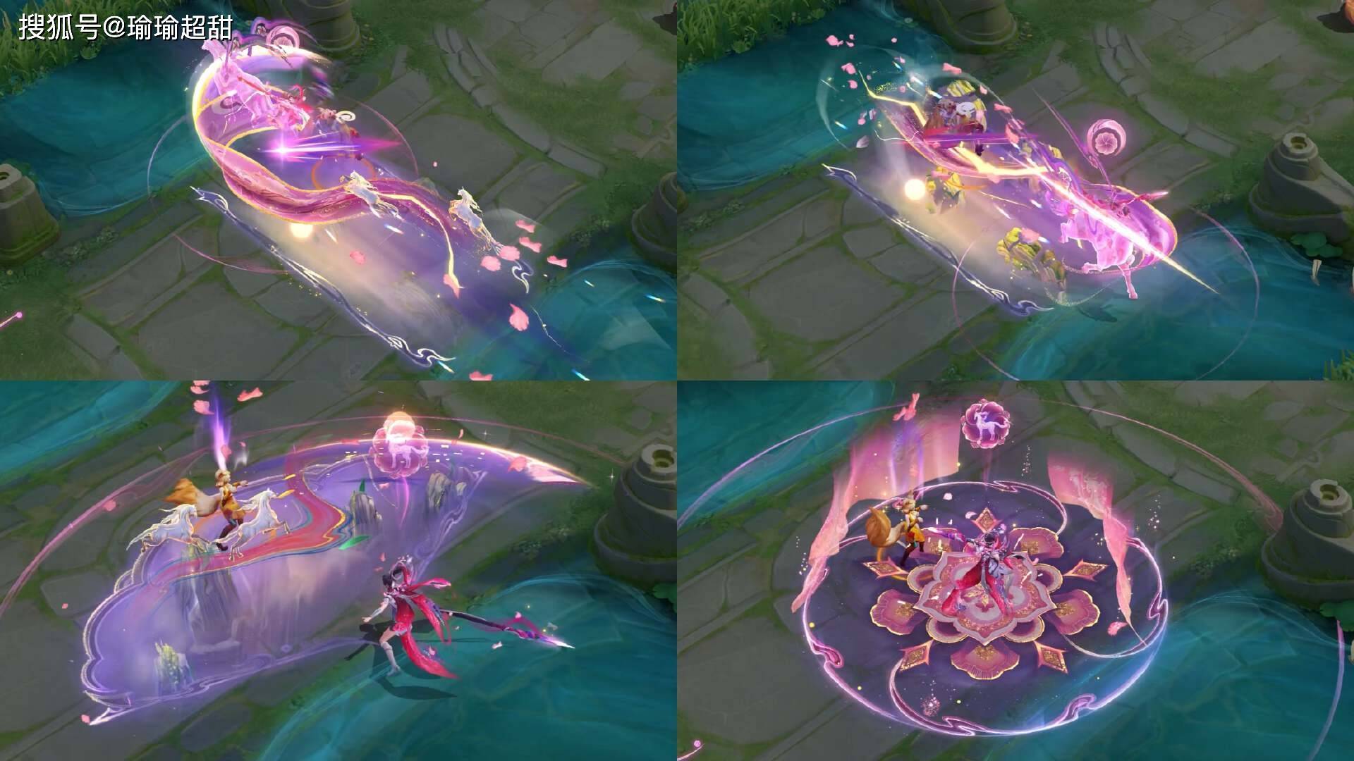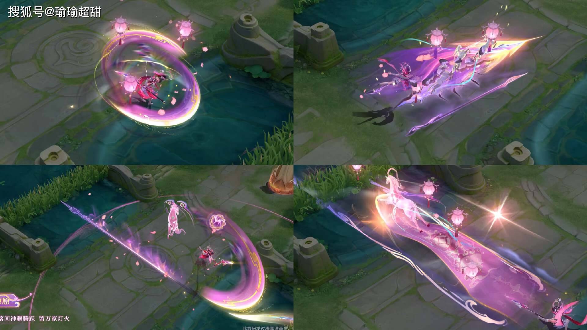 然后再来看一下被动技能的特效,不得不说,被动技能的三种施法效果都展现出了一种非常高级的感觉,可以看到每个被动技能的特效中,都有展现花瓣特效和灯笼特效,以及还可以看到有马儿在奔跑,特别是第三种形态的被动,马儿向前冲,地面上还会出现画卷,展现了一股既高级又好看的效果。