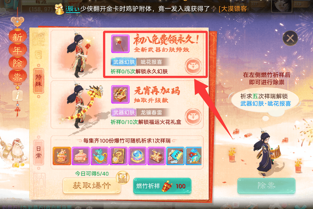 初八免费领永久武器皮肤特效——呲花报喜,这个新年除祟活动,需要集齐100个爆竹,然后祈求1次祥瑞,有种“鞭炮一响,黄金万两”的感觉。然后祈祥之后,就可以解锁武器幻肤·小呲花,小呲花祥瑞仅能在初八这一天进行,完成后就可以得到永久幻肤了。