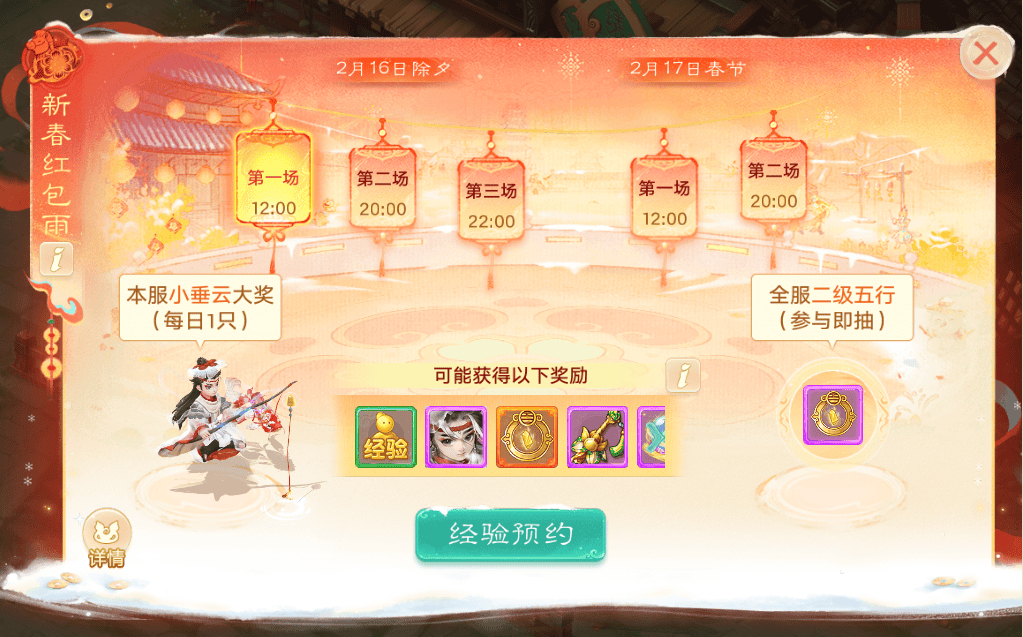 首先第一个,肯定就是除夕红包雨了,2月16日除夕,2月17日春节开放经验预约,大家可以注意一下红包雨时间,第一场是中午12:00,第二场是晚上20:00,第三场是22:00,除了经验、神兵、五行材料、聚魄丹、见闻录,全服还有一只小垂云大奖等待狗托抽中。