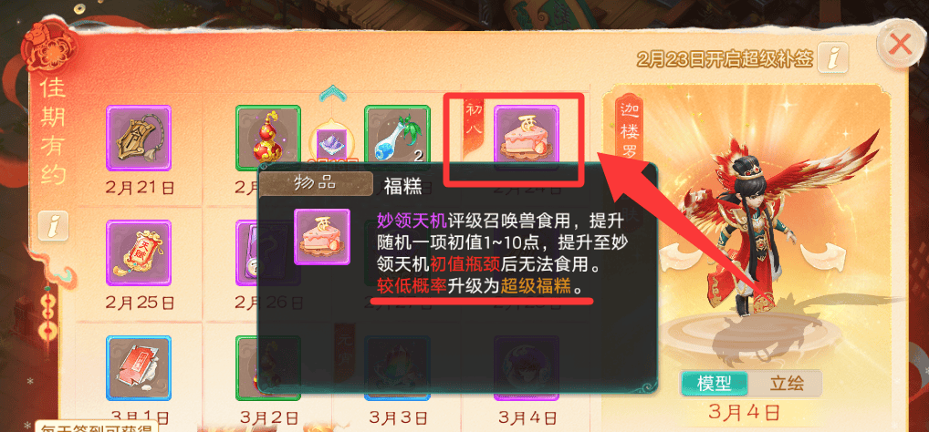 2月9日、2月12日、2月24日,签到必得福糕,妙领天机的召唤兽使用之后,可以提升随机一项初值1~10点,较低概率会升级为超级福糕。反正每年这一个福糕是必吃的!