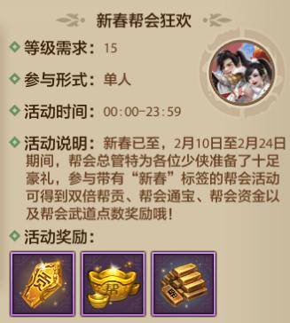 而轻松版的少侠,参与带有“新春”标签的帮会活动,则可以得到双倍帮贡、帮会通宝、帮会资金奖励!
