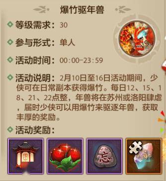 说到新年,咱们的老朋友年兽也是再次光临,2月10日至2月16日期间,各位少侠可使用从日常副本中获得的爆竹,前往苏州或洛阳阻止年兽的破坏,守护天龙居民的新春佳节,成功赶跑年兽还有小礼品可以领哦~
