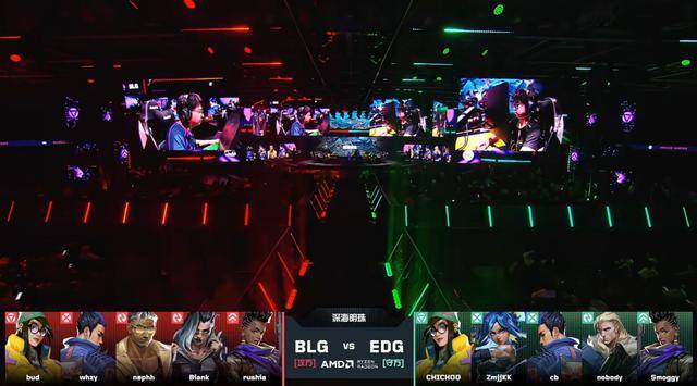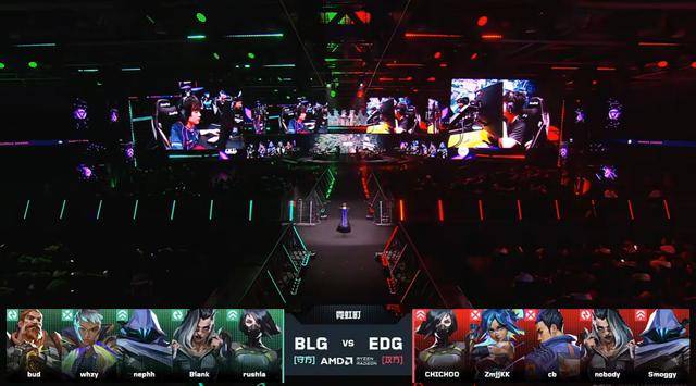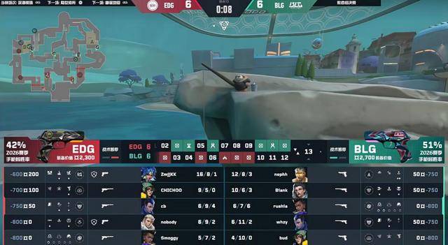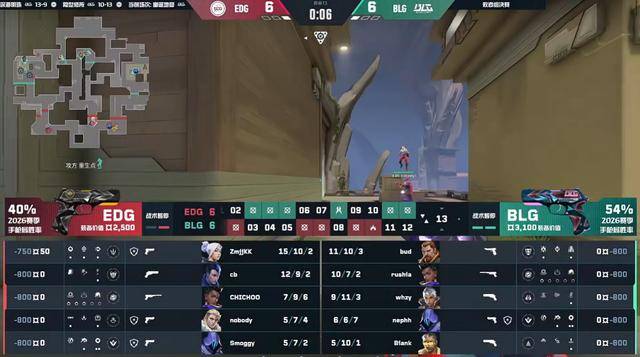 BLG拿到比分领先。第11回合A点的攻守,球球与Smoggy回防打赢,EDG稳住局势,随后康康霓虹包点游龙四杀打掉BLG的进攻。上半场两队打成6平。