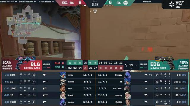 上半场BLG赢下手枪分,EDG赢下奖励局,并打出三连胜。