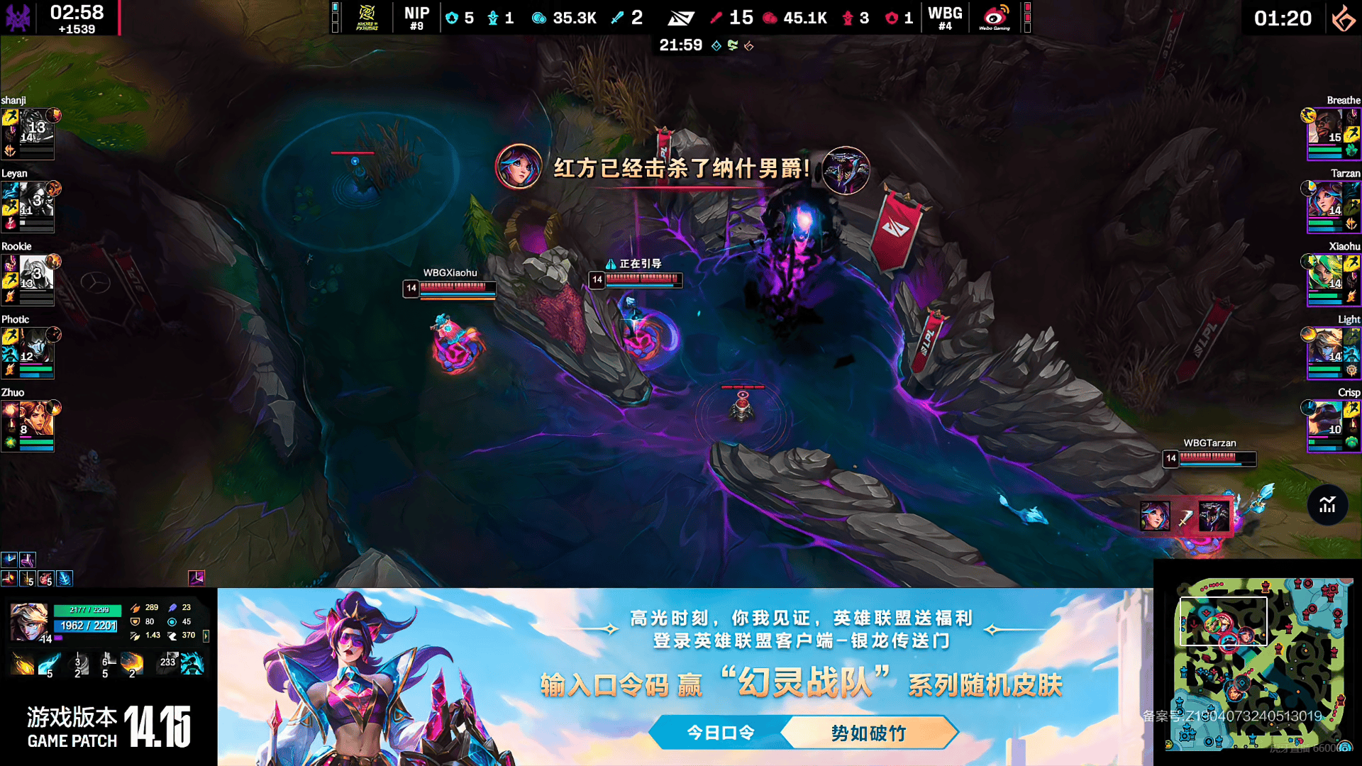 17分钟小龙团,Rookie砍下四杀,随后又推掉WBG中一塔。WBG正面已经被NIP打花,比赛20分钟NIP已经15-3WBG。21分钟上路,WBG合力将Rookie击杀,但随后NIP的队友支援到,NIP一波1换4,顺带拿下大龙。