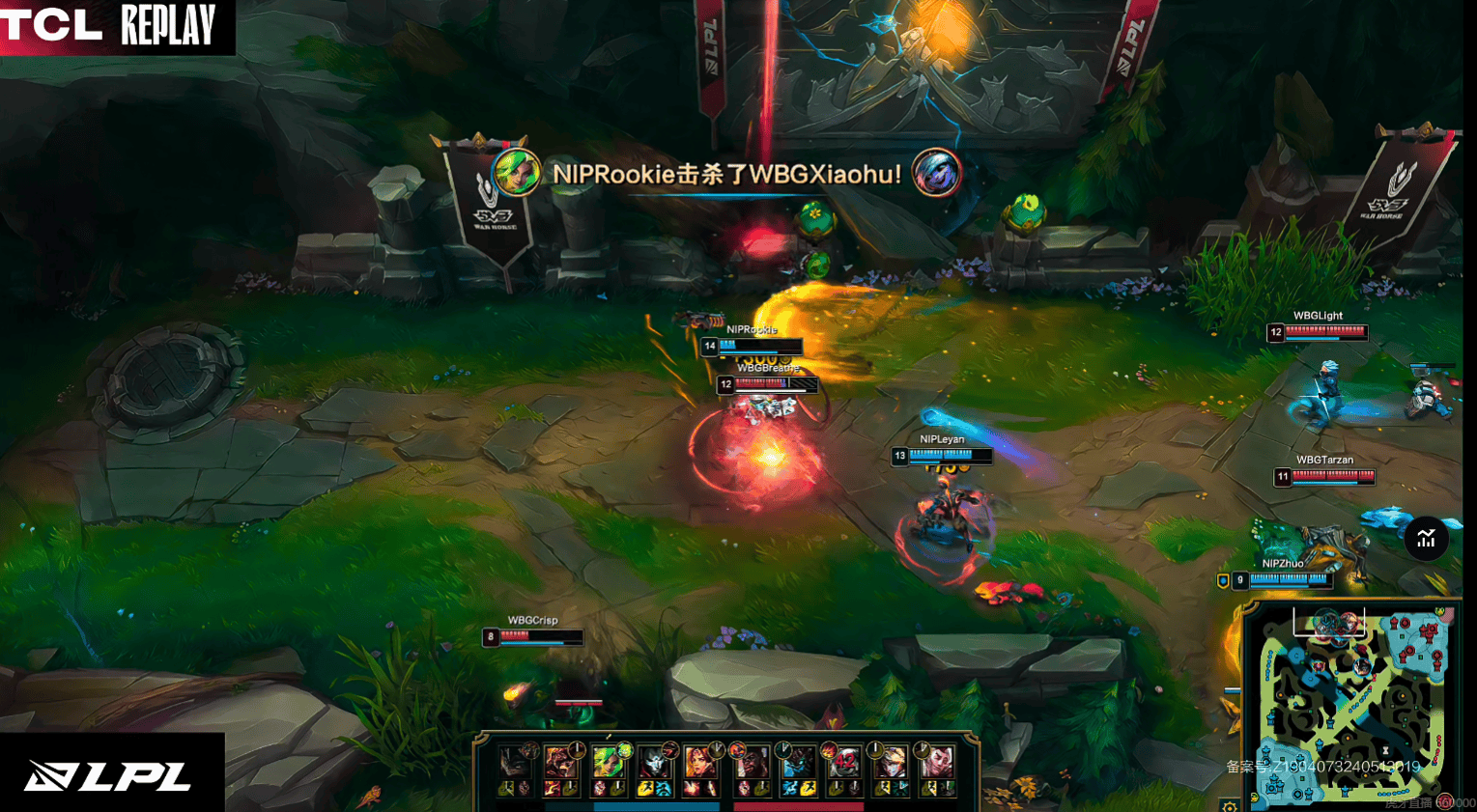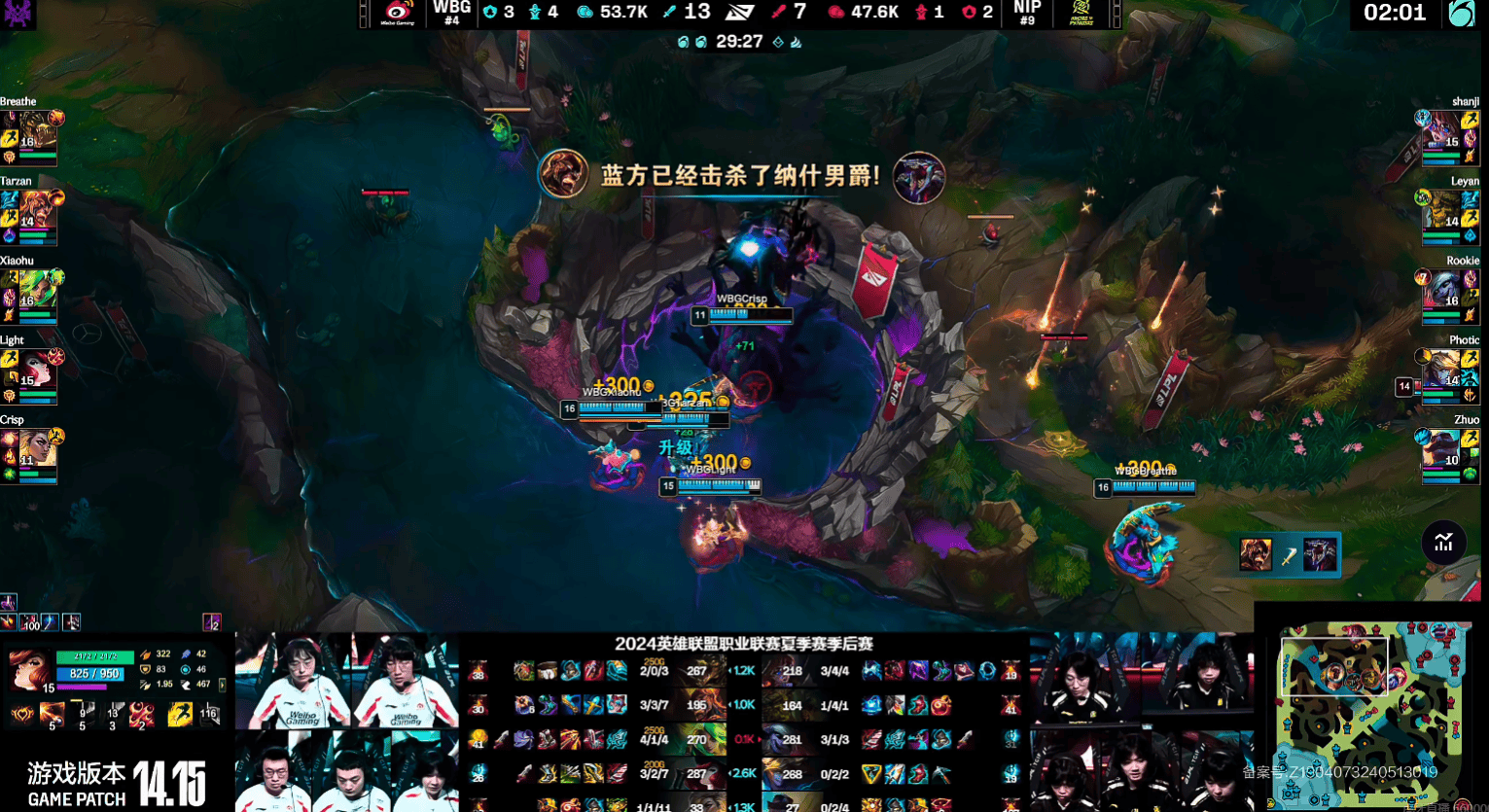 NIP推掉WBG下路高地,并在高地上将WBG三人击杀,NIP在24分钟就将WBG给击败。