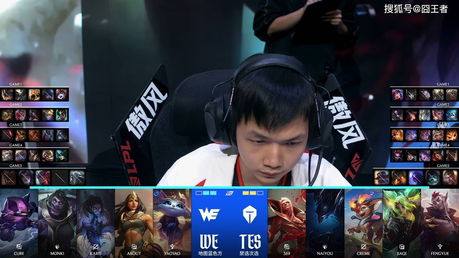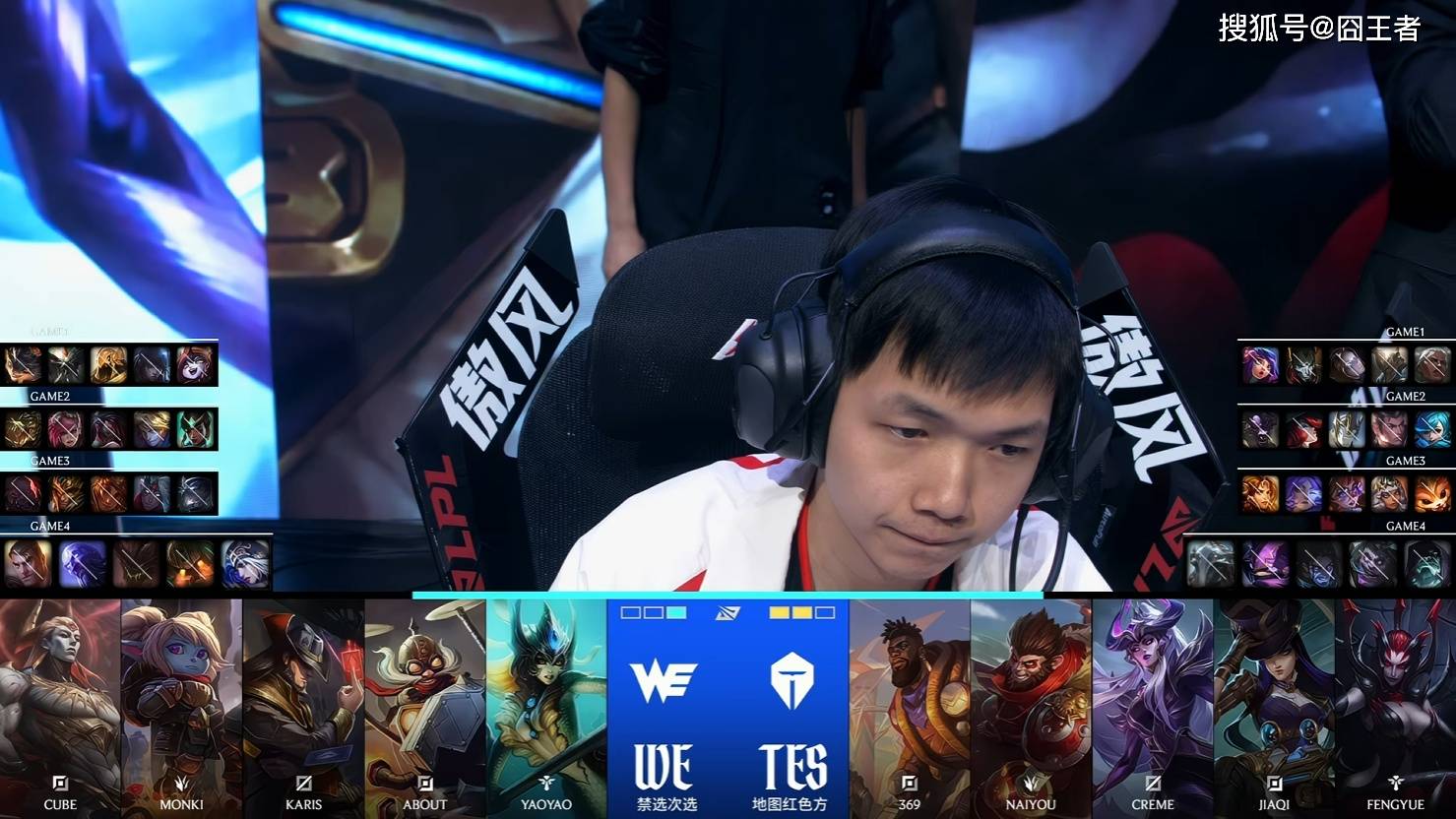 决胜局,WE蓝色方,禁用:石头人,卡莎,永恩,空ban,维克托,选用:Cube凯南,Monki蒙多,Karis塞拉斯,About希维尔,yaoyao猫咪;TES红色方,禁用:杰斯,掘墓,瑞兹,泰坦,布隆,选用:369吸血鬼,Naiyou梦魇,Creme小火龙,JiaQi泽丽,fengyue洛