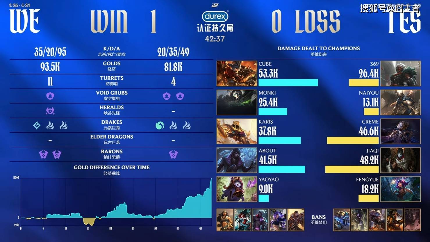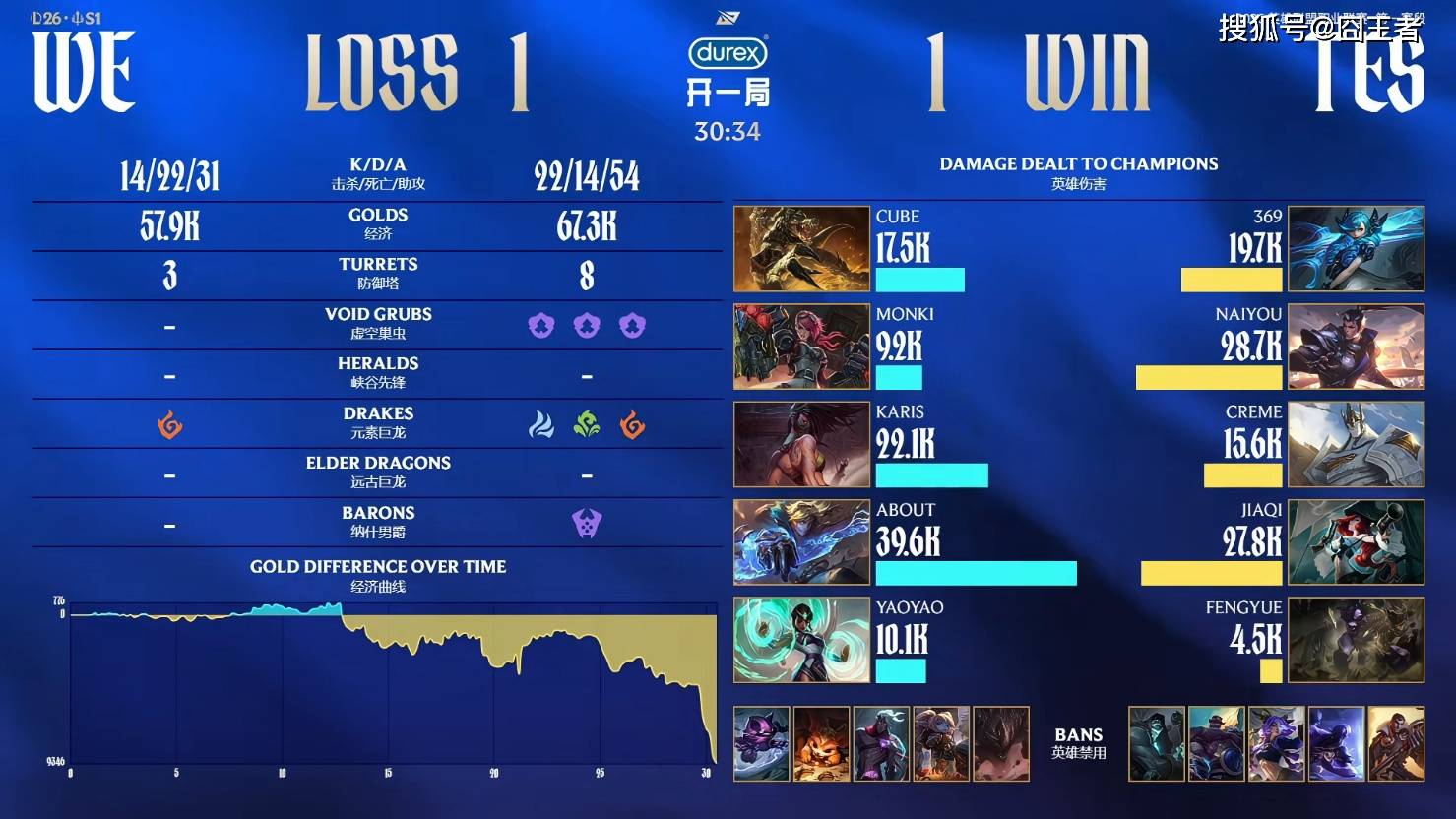 第一局比赛,WE蓝色方,禁用:杰斯、芸阿娜、韦鲁斯、女枪、轮子妈,选用:Cube兰博、Monki蝎子、Karis沙皇、About月男、Yaoyao露露;TES红色方,禁用:石头人、皇子、波比、牛头、EZ,选用:369狼母、naiyou潘森、Creme发条、jiaqi烬、fengyue妮蔻
