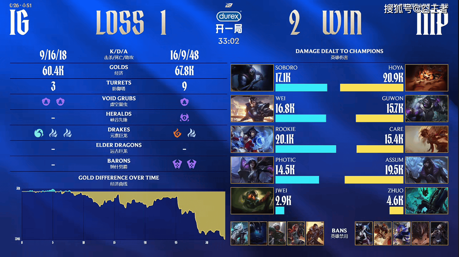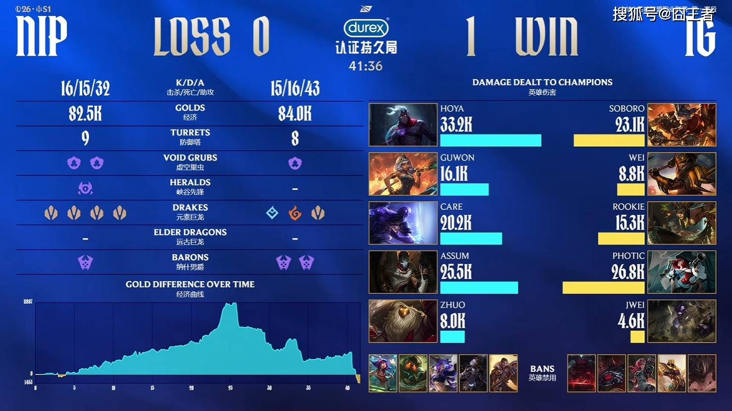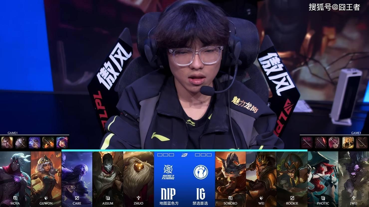 第一局比赛,NIP蓝色方,禁用:杰斯,发条,芸阿娜,泰坦,妮蔻,选用:HOYA韦鲁斯,Guwon琪亚娜,Care瑞兹,Assum瑞兹,Zhuo巴德;IG红色方,禁用:石头人,沙皇,蔚,塞恩,奥恩,选用:Soboro兰博,Wei皇子,Rookie蛇女,Photic女枪,Jwei牛头