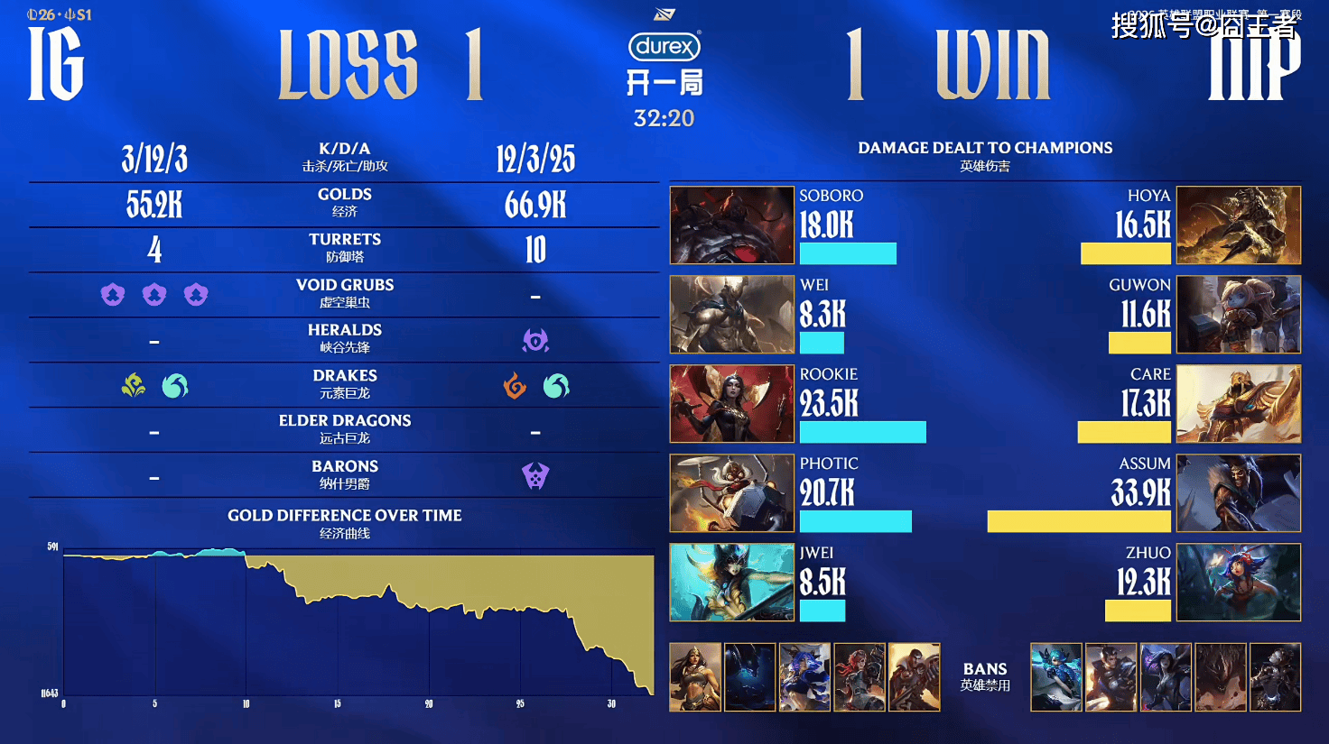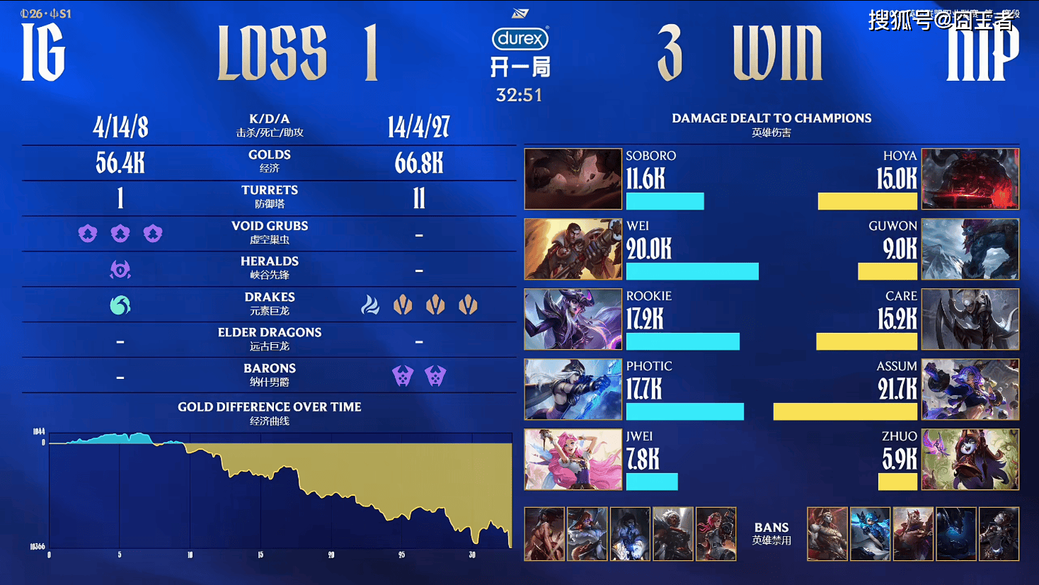 结果第四局比赛,除了开头五分钟,是IG的好局外,剩余时间,全部交给NIP。5分钟左右:HOYA奥恩上路发难打残石头人,Soboro残血不回被塔下强杀;7分钟左右:双方下路对拼Zhuo璐璐跟闪成功线杀Photic寒冰;12分钟左右:NIP奥恩叫羊配合皎月大招进场组合技瞬秒IG中野;18分钟左右:杰斯上头闪现追击残血皎月被反打,NIP打出零换三;30分钟左右:皎月大到三人后石头人大招逃跑,NIP击杀野辅打出零换二;最终32分51秒:NIP再次进攻高地强拆一波结束比赛