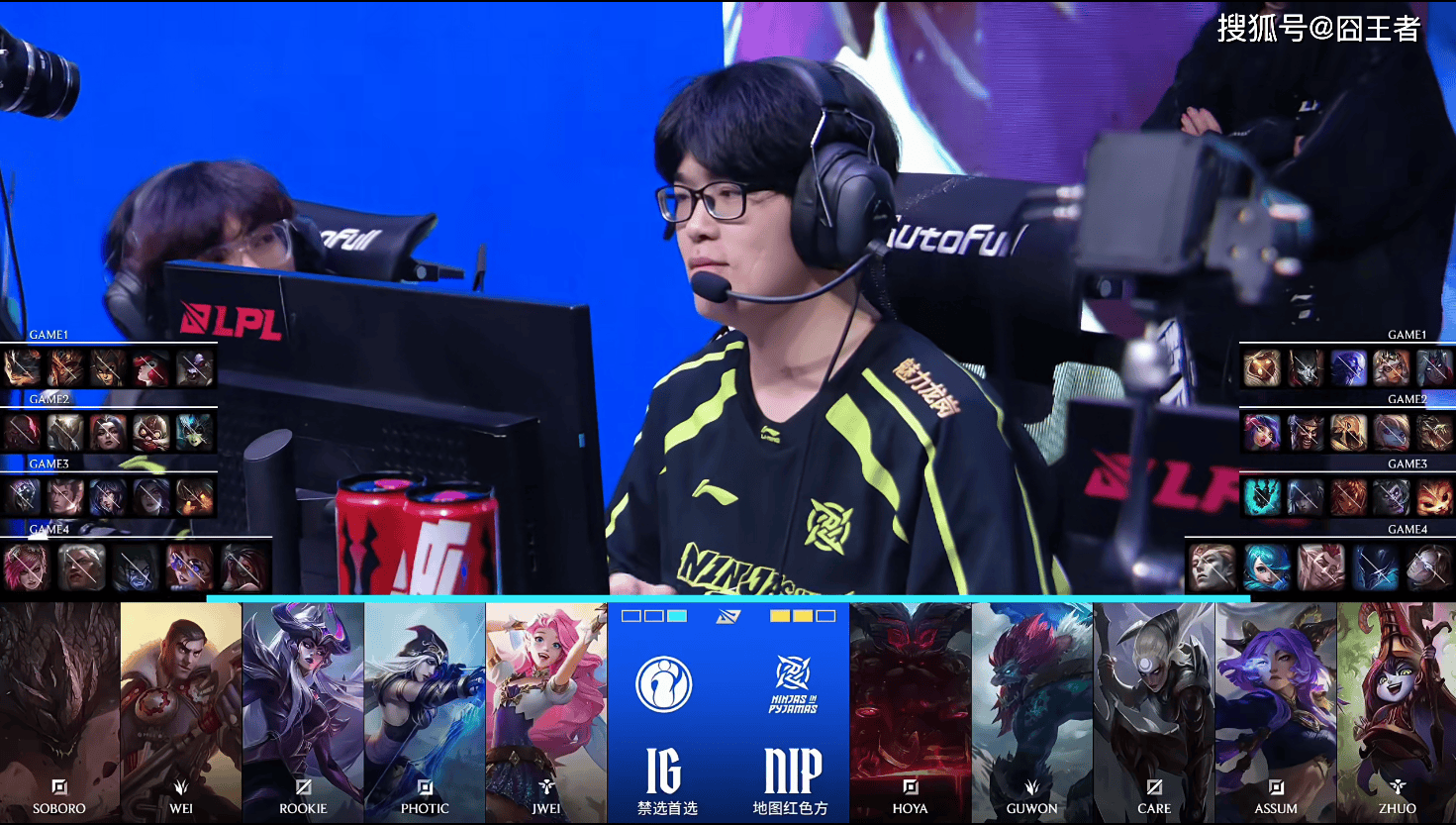第四局比赛,IG蓝色方,禁用:蔚,狼母,塞拉斯,阿萝拉,阿卡丽,选用:Soboro石头人,Wei杰斯,Rookie辛德拉,Photic寒冰,Jwei萨勒芬妮;NIP红色方,禁用:发条,梦魇,洛,格温,亚恒,选用:HOYA奥恩,Guwon巨魔,Care皎月,Assum芸阿娜,Zhuo璐璐