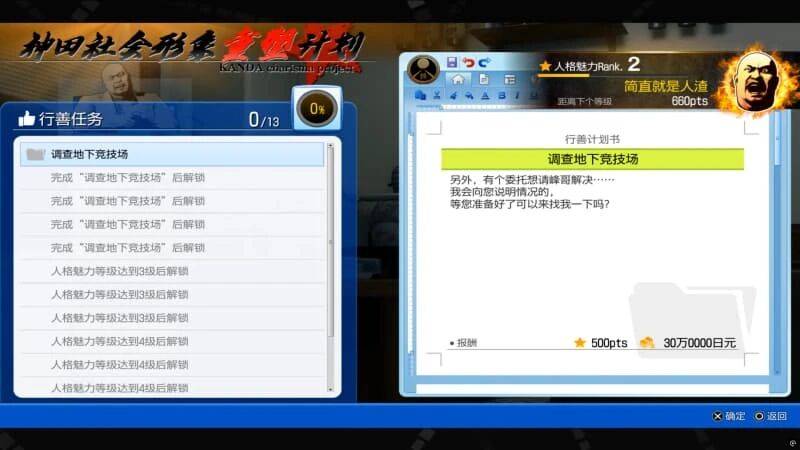 除了剧情,外传还有个“神田领袖魅力计划”玩法,要求我们完成各项委托与事件,以此提升 神田 大哥的路人风评。